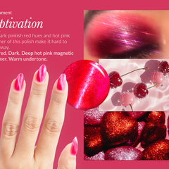Pink red. Dark. Deep hot pink magnetic shimmer. Opaque. Warm undertone.